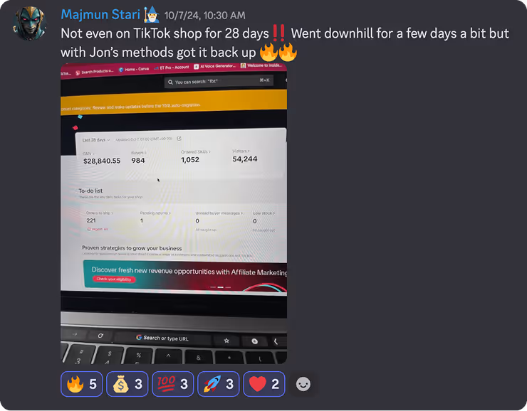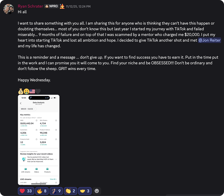 Fast forward to 2025, I’ve gone from $10/hour to consistently pulling in $100k+ per month in PROFIT as a TikTok Shop Seller. But here’s the kicker—I’ve also helped hundreds of others replicate this success and cash in on this e-commerce gold rush.